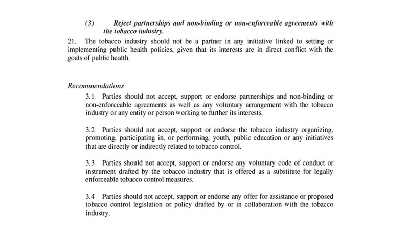 But these partnerships are clear violations of the World Health Organization’s anti-smoking treaty, the Framework Convention on Tobacco Control (FCTC), which forbids any cooperation between governments and the industry.