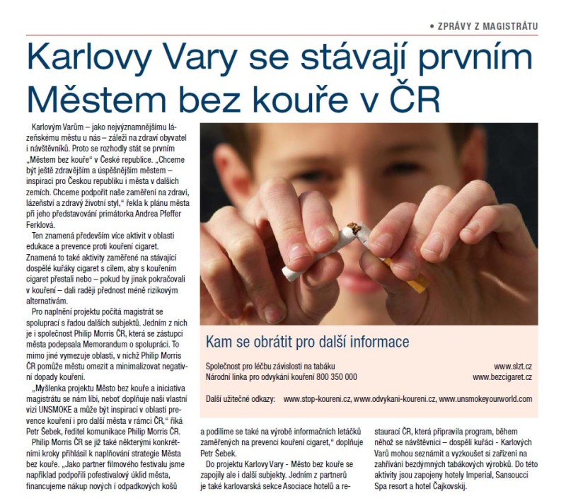 But the official City Hall newsletter, “Radniční listy,” has promoted the tobacco company’s collaboration with the municipality. It also published an article directing smokers to the PMI-registered website unsmokeyourworld.com.