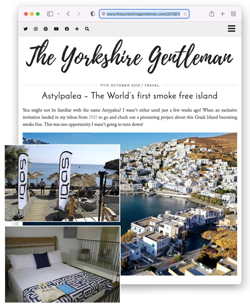 A lifestyle blogger known as The Yorkshire Gentleman, who attended the PMI-sponsored junket to promote Astypalaia’s new smoke-free status, posted photographs showing how IQOS was advertised at a smoke-free beach he visited. The blogger also raved about the luxury hotel where PMI put him up –– and made sure to mention IQOS.